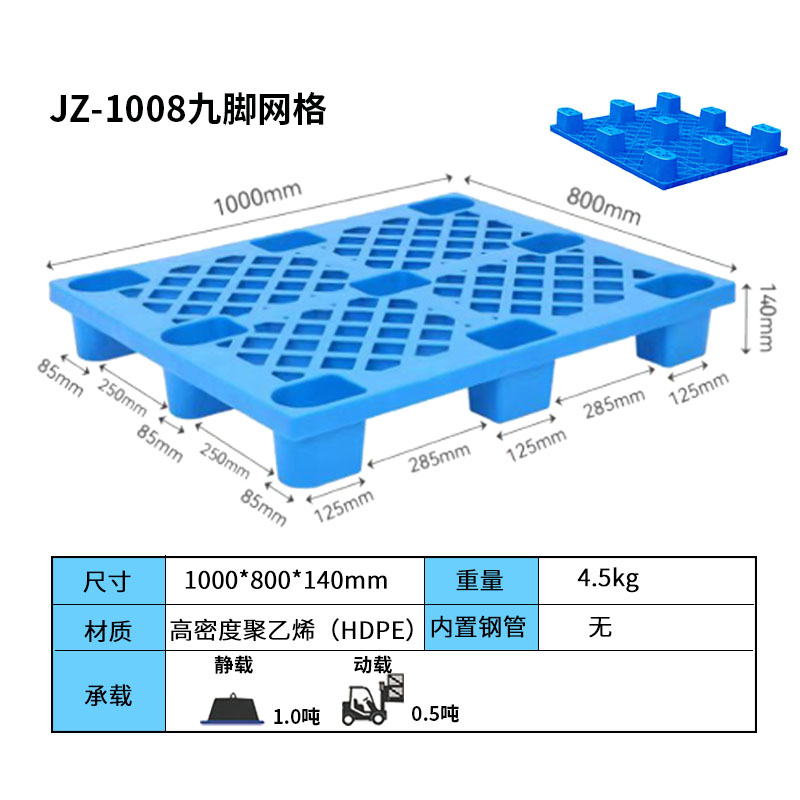 九腳網(wǎng)格塑料托盤的九腳網(wǎng)格托盤其底部是有‘九個(gè)腿’組成的,表面為‘網(wǎng)格’狀,顧行業(yè)為方便稱其為九腳網(wǎng)格托盤,九腳網(wǎng)格托盤大多型號(hào)的都為輕型的塑料托盤,不易用于上貨架或者較重貨物的周轉(zhuǎn)使用,大多情況下九腳網(wǎng)格塑料托盤都是用來(lái)倉(cāng)庫(kù)貨物墊倉(cāng)板防潮使用,對(duì)于輕型貨物的周轉(zhuǎn)也可。